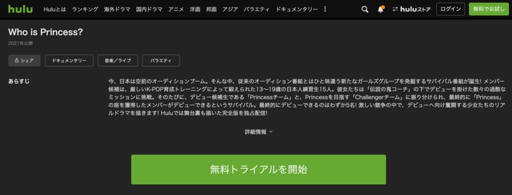 Huluは通常月額1,026円(税込)ですが、最大2週間の無料お試し期間があり、「Who is princess?(シューイチ オーディション)」が独占見放題配信されています。